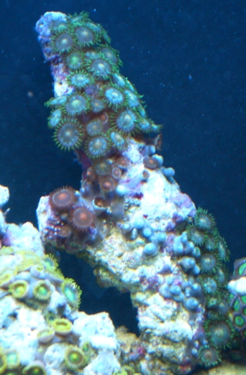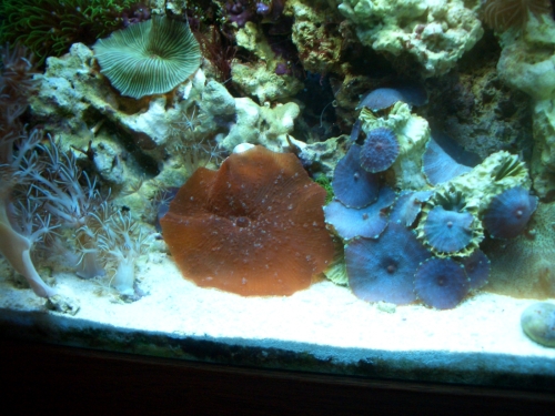 I picked up these two corals while I was there. The orange shroom is huge and doing well. The zoanthid frag has a great spearmint color and also had a few orange polyps on it.